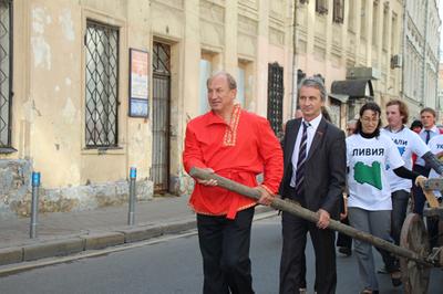 Акция завершилась инсценированным отнятием «премии мира» у куклы «Обамы», которого переехала телега.