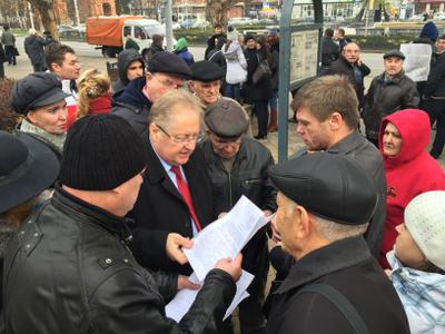 Встречи с депутатом ожидали две большие инициативные группы: дальнобойщики, владельцы и водители большегрузного транспорта и работники завода «Седин». И с теми и с другими представители Краснодарского городского отделения КПРФ, а также лично Сергей Павлович уже встречались. И сейчас люди, находящиеся в отчаянии, вновь пришли к депутату за советом и узнать какова реакция органов государственной власти на их просьбы, законные требования и протест. Люди держали плакаты-обращения с призывами о помощи к депутату Госдумы от КПРФ.