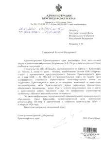 06.12.2020 года из администрации Краснодарского края поступил ответ, из которого следовало, что по результатам переговоров департамента строительства Краснодарского края с фирмой ООО «Каркас-строй» последняя взяла на себя обязательства по завершению строительства жилого комплекса «Южный».