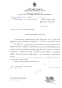 С.П. Обухов и В.Ф. Рашкин не остались в стороне и после получения от дольщиков обращения направили депутатский запрос губернатору Краснодарского края, в котором подняли вопрос об организации работы по поиску инвестора для данных проблемных объектов, а в дальнейшем взяли на контроль ход данной работы.