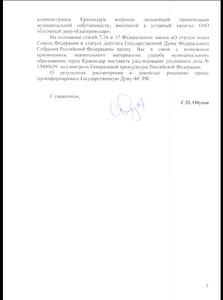 А еще депутат Госдумы С.П. Обухов попросил ответить Генерального прокурора РФ на вполне естественные по этому случаю вопросы — кто конкретно ответит за увод из муниципальной собственности памятника архитектуры и имел ли право глава администрации Краснодара определять размер долей в создаваемом ОАО без надлежащей оценки размера вклада второго учредителя?