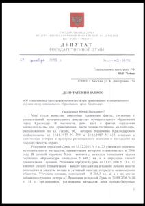 В своем депутатском запросе коммунист, помимо всего прочего, обратил внимание главного прокурора страны на такие, к примеру, факты. Процентное соотношение долей в ОАО «Гостиный двор «Екатеринодар» было определено не на основании независимой оценки, как положено по закону, а главой администрации муниципального образования город Краснодар — постановлением № 741. Сами же доли составили: с одной стороны — муниципальное имущество, имеющее статус памятника архитектуры, а с другой — вексель некого ООО, в котором доля кредиторской задолженности (заемных средств) равнялась к 99,9 %.