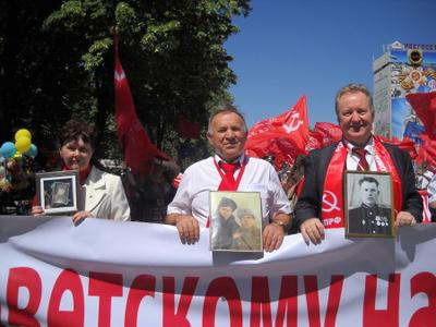 В голове колонны депутаты Государственной Думы и Законодательного Собрания края, руководители краевого и городского Комитетов КПРФ, партийные активисты транспарант со словами «Спасибо советскому народу за Победу над фашизмом». Ряд участников шествия держали в руках фотографии своих родных, воевавших в 1941-45 годах.