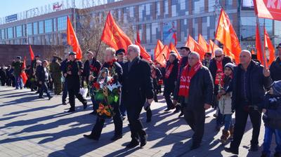 Затем колонна демонстрантов – под красными Знаменами Победы, флагами КПРФ и ЛКСМ, «Детей войны» и родов войск – прошла по центральным улицам города – Красной и Северной – к мемориалу на площади Павших героев. Здесь участниками акции были возложены цветы к Вечному огню. «Героям Красной Армии – от КПРФ» – начертано на ленте корзины цветов.