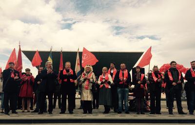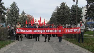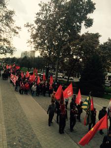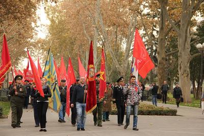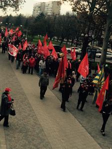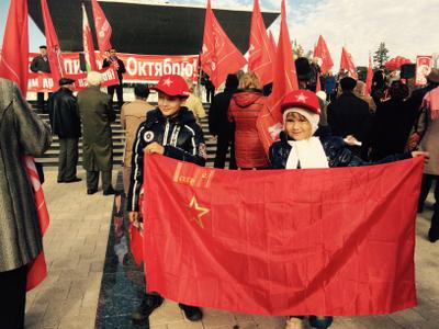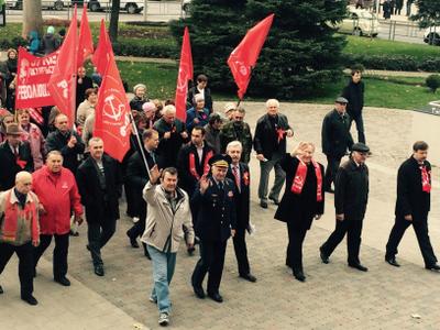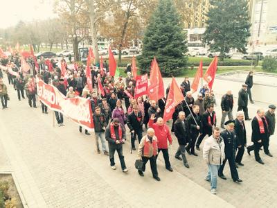 «Слава Великому Октябрю!», «Долой министров-капиталистов!», «Нет НАТО – на русской земле», «Новороссия, мы с тобой!» – такими были главные транспаранты, растянутые вдоль колонны. Духовой оркестр при этом на протяжении всего маршрута исполнял марши и мелодии советской поры.
