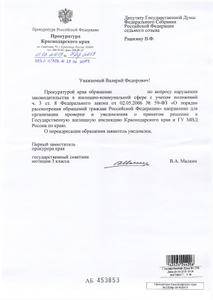 Рассмотрев данное обращение С.П. Обухов и В.Ф. Рашкин приняли решение направить депутатский запрос в прокуратуру Краснодарского края с настоятельной просьбой провести проверку изложенных сведений.