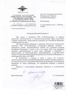05.04.2019 года в адрес Государственной Думы поступил ответ №3/196101163314 из ГУ МВД России по Краснодарскому краю, в котором сообщалось, что при рассмотрении обращения жителей правоохранительные органы установили признаки уголовно-наказуемого деяния, предусмотренного статьей 159 УК РФ, в связи с чем результаты проверки были зарегистрированы в книге учёта заявлений и сообщений о преступлениях, а материал направлен для дальнейшей проверки в УМВД России по городу Краснодару.