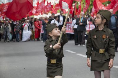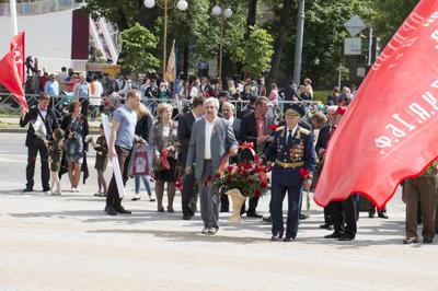 За ними шла «коробочка» советских офицеров – в мундирах и в полевой форме. Следующая группа демонстрантов – актив краевой организации «Дети войны». А далее – коммунисты городского отделения партии и сторонники КПРФ – с сотней красных стягов Победы и партийными флагами.