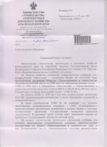 Депутату Госдумы С.П. Обухову пришел ответ на его запрос от первого заместителя министра Министерства строительства архитектуры и дорожного хозяйства Краснодарского края В.В. Тимошенко.