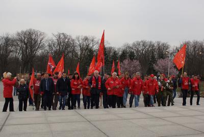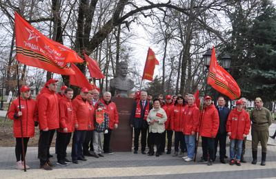 Затем колонна из десятка автомашин под красными флагами проехала в центр города, в Парк Победы. Здесь были возложены цветы к Вечному огню. Также участники акции почтили память советских полководцев – маршалов Жукова, Василевского, Рокоссовского и других, и, конечно, Верховного Главнокомандующего И.В. Сталина, чьи бюсты установлены на одной из парковых аллей.