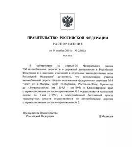 Распоряжением Правительства РФ № 2268-р от 14.11.2014 года на недавно реконструированном за федеральные средства участке трассы «М-4» длинной 75 км (км 1119,5 – км 1195) на территории Краснодарского края введена плата за проезд.