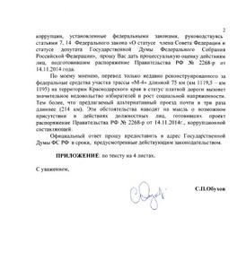 Депутат С.П.Обухов предположил, что указанные обстоятельства наводят на мысль о возможном присутствии в действиях должностных лиц, готовивших проект распоряжение Правительства РФ № 2268-р от 14.11.2014г., коррупционной составляющей. Трудно представить, что чиновник, находящийся в здравом уме, без соответствующей "аргументации", будет называть равноценными маршрутами 75 км новенькой федеральной автортрассы и 214 км объездной дороги по станицам Кубани и Ростовской области.