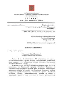 Депутат Госдумы С.П. Обухов направил депутатские запросы Генеральному прокурору Российской Федерации Ю.Я. Чайке и Председателю Следственного комитета Российской Федерации А.И. Бастрыкину.