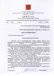Эта информация привлекла внимание депутата Государственной Думы VI созыва С.П. Обухова и депутата Государственной Думы VII созыва В.Ф. Рашкина, которые обратились в Избирательную комиссию Краснодарского края и администрацию Краснодарского края с просьбой проверить информацию, изложенную в указанной публикации, размещенной на сайте «Живая Кубань».