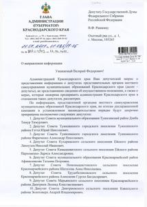 Администрация Краснодарского края сообщила депутату Госдумы 6-го созыва С.П. Обухову и депутату Госдумы 7-го созыва В.Ф. Рашкину список муниципальных депутатов Краснодарского края, виновных в нарушении антикоррупционного законодательства.