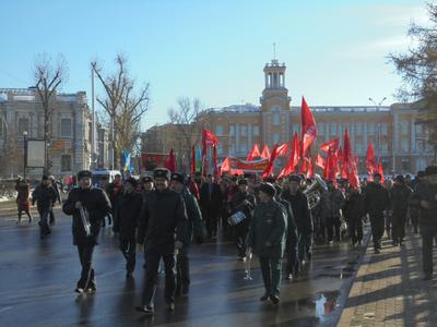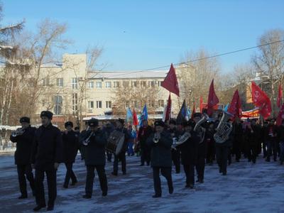 После под исполненный "Сполохом" "Гимн коммунистов Восточной Сибири" участники митинга построились в колонну и по центральной ул. Ленина двинулись колонной к Вечному Огню. Впереди, играя "Песню защитников Москвы" и "Прощание славянки" маршировал оркестр. С тротуаров за шествием наблюдали многочисленные прохожие.