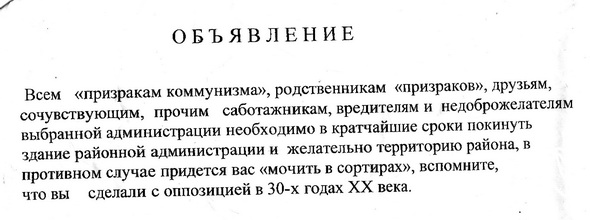 На следующее утро в туалетной комнате районной администрации, где работники собираются покурить, на видном месте было обнаружено «объявление»: