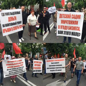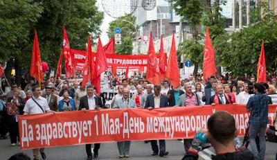 Над колонной, которая шла под марши, исполняемые духовым оркестром, реяло множество красных флагов. Участники акции несли транспаранты – с социально-экономическими лозунгами и требованиями, обращенными к властям всех уровней – от федерального до местного. С помощью мегафонов озвучивались лозунги праздника и протеста.