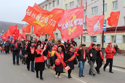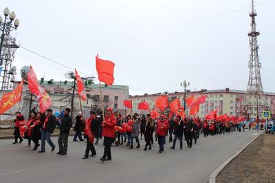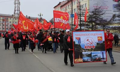 Магаданские коммунисты приняли участие в общегородском шествии, посвященному этому празднику. Яркие, красочные колонны предприятий, общественных организаций, политических партий рекой текли по главной улице города – проспекту Ленина, к центральной площади города.