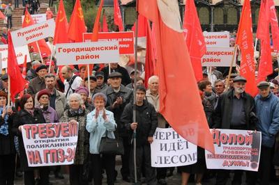 Митинг начался в полдень на Советской площади у кинотеатра “Родина”. Пензенцы держали в руках плакаты: “Чернов идет лесом”, “Долой транспортных лоббистов из городской Думы”, “Общественный транспорт должен работать до 23.00” и другие. Каждый пришел на митинг со своими требованиями. Жители ГПЗ-24 требовали открытия больницы в своем микрорайоне, так как вынуждены ездить на “Маяк” за медицинской помощью, а многим, особенно пожилым людям это создает неудобства. Жители дома № 7 по улице 8 Марта держали в руках плакаты: “Пора сажать деревья и чиновников”, “Хватит вырубать скверы”. Под окнами их дома спилили деревья и теперь брат депутата-единоросса Акчурина строит на этом месте трехэтажный торговый центр.