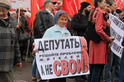 Майор в отставке, коммунист Виктор Первун отметил, что “не может быть днем мира и труда, праздник рожденный 126 лет назад возмущенным пролетариатом в ответ на зверства американской полиции по отношению к рабочим, которые вышли требовать 8-часового рабочего дня и улучшений условий производства”. Еще один офицер, капитан третьего ранга в отставке Юрий Ворончихин заявил, что “радость и эйфория от присоединения к России Крыма не должна закрыть нам глаза на те проблемы, которые сейчас происходят у нас и никак не заканчиваются”.