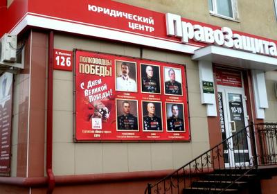 Кроме того, пользуясь тем, что на самом удобном месте – перекрестке улиц Ленина и К.Мяготина – где очень большой поток машин, находится приемная юридического центра «ПравоЗащита» депутата городской думы от КПРФ Я.С. Сидорова, использовали стены здания для размещения стенда «Полководцы Победы».