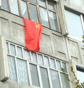 С балконов некоторых домов вывешены флаги СССР и копии Знамени Победы.