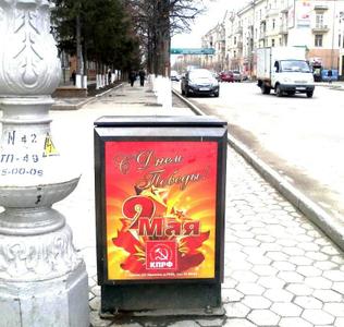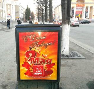 В канун 9 мая коммунисты Кургана поздравили жителей областного центра красочным образом, разместив баннеры на рекламных скамейках, сити-форматах, би-боксах.