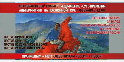 Сразу после митинга Кургинян в передаче «смысл игры – 10» заявил: «Антиоранжевый комитет, как и Антиоранжевый пакт, как и антиоранжевый митинг на Поклонной горе инициирован мною лично и организацией "Суть времени"». Это в высшей степени примечательное заявление, поскольку официальными организаторами митинга были «Российский союз ветеранов Афганистана», партия «патриоты России», «Союз пенсионеров России» и «Конгресс русских общин». Хорошенькие организации выполняют инициативы «его лично и организации «Суть времени»! Ведь все они входили в т.н. «Общероссийский народный фронт», созданный Путиным перед выборами для того, чтобы не ассоциировать себя с надоевшей всем «Единой Россией».