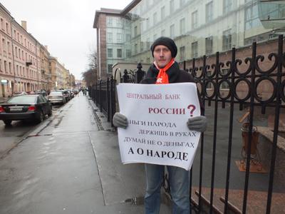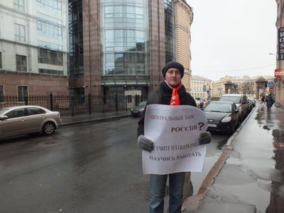 Коммунисты Центрального района Санкт-Петербурга продолжают серию пикетов у Санкт-Петербургского отделения Центрального банка России "Не учите плавать рубль!" за отставку главы ЦБ Эльвиры Набиуллиной и всего финансово-экономического блока правительства во главе с Медведевым.