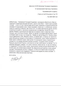 «Уважаемый Геннадий Андреевич, вынуждена обратиться к Вам за помощью. Я одинокая многодетная мать, сирота, мне 30 лет. У меня трое сыновей: 3,5 года, 8 лет и 12 лет. Воспитываю деток одна. Оказалась в трудной жизненной ситуации. В наше время очень тяжело выживать таким, как я, к сожалению, органы опеки не торопятся помогать нам. Из-за того, что имею малолетних детей, не могу устроиться на работу, накопился огромный долг за квартиру, более 90 тысяч рублей. Живём в однокомнатной квартире на первом этаже, в квартире очень холодно, дети постоянно болеют. Денег не хватает на элементарные вещи, порой не бывает даже на еду и на лекарства. Живём за чертой бедности. Органы опеки после обращения к ним обещали помочь, но время идёт, а помощь не торопится, даже обещанные продукты не доставили. К сожалению, очень тяжело выживать в моей горячо любимой стране, имея детей. Но население страны стремительно снижается, и не каждая женщина решается рожать. Я родила троих сыновей, будущих защитников Родины, а сил растить их при такой жизни не хватает. По ТV-каналам Президент твердит, что нужно помогать таким, как мы. Но где эта помощь и поддержка? Я люблю свою страну, своих детей и желаю им достойной жизни, но не могу дать им элементарных вещей».