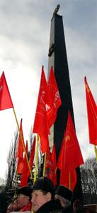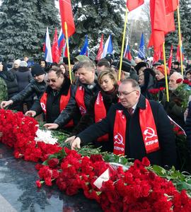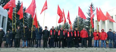 Курские коммунисты вышли на Мемориал памяти павших с алыми знаменами, в накидках. По традиции возложили живые цветы к Вечному огню, к памятнику С.Н. Перекальскому, другим памятным местам.