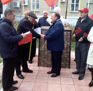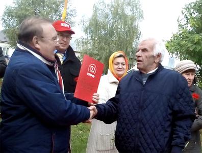 Первый секретарь Курского ОК КПРФ, депутат Государственной Думы ФС РФ, Председатель ЦКРК КПРФ Н.Н. Иванов вручил Благодарственное письмо депутата Госдумы братьям Пахомовым: Анатолию Семеновичу и Владимиру Семеновичу, а также всем, кто помогал в восстановлении памятника В.И. Ленину.