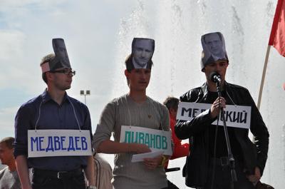 Живой интерес вызвало театрализованное представление, организованное ленинградскими комсомольцами, в ходе которого трое ребят, играя роли министров-капиталистов Медведева, Мединского и Ливанова, ознакомили участников митинга с наиболее одиозными высказываниями деятелей правительства, наподобие известных медеведевских цитат: «ВТО — это не морковка, а набор довольно сложных обязанностей» и «Свобода лучше, чем несвобода». В завершение номера появившийся на сцене рослый комсомолец прогнал с трибуны никуда не годных «правителей».