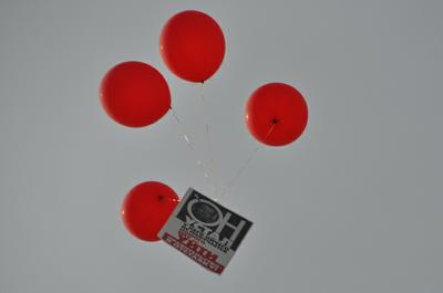 В этот момент с помощью четырех наполненных гелием воздушных шаров в воздух был запущен плакат с требованием отставки правительства.