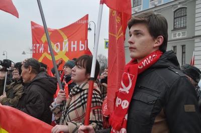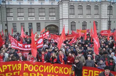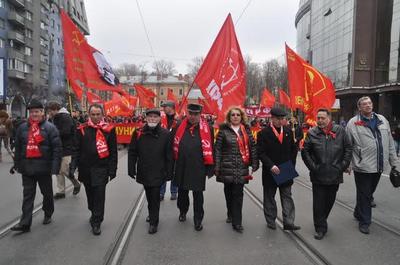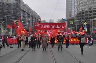 Колонны демонстрантов, среди которых были члены КПРФ, Ленинского комсомола, Союза Советских офицеров, Всероссийского женского союза «Надежда России», движения «Дети войны», Коммунистической партии Финляндии, ВСД «Русский лад», Коммунистической партии Финляндии, обманутых дольщиков, пострадавших от вредительских действий ЦБ РФ валютных заемщиков и других общественных организаций города прошли по улице Академика Лебедева, Боткинской улице, Финляндскому проспекту через Сампсониевский мост до Петроградской набережной к месту вечной стоянки легендарного крейсера «Аврора», где и состоялся митинг коммунистов.