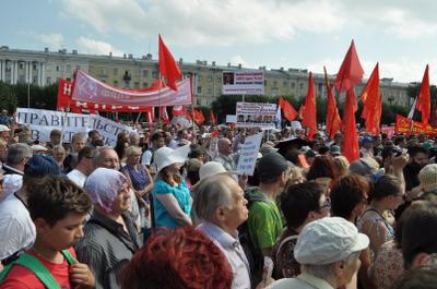 Ещё задолго до начала митинга собиравшиеся на площади граждане, ранее никогда не замечавшиеся на протестных выступлениях, зло и оживлённо рассуждали, что это очередной плевок власти в душу народа – после выборов с космической скоростью поднимаются цены, растут налоги. Они справедливо задавались вопросами, почему предвыборная кампания Путина не проводилась именно под такими лозунгами: «Сильный президент – пенсия в морге» и «Работал до смерти – помог государству»?