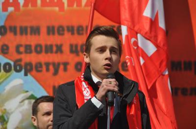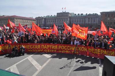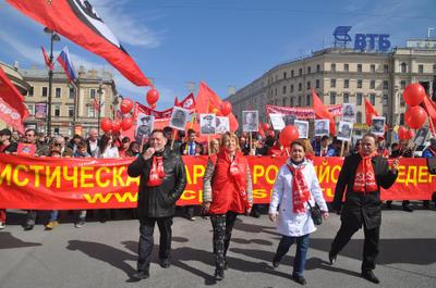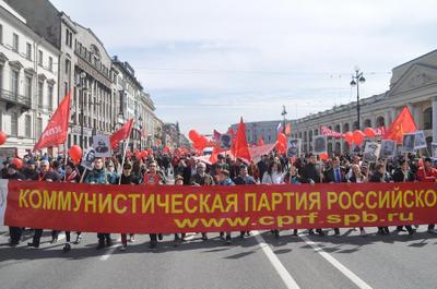Вместе с КПРФ и Ленинским комсомолом РФ в колонне коммунистов по главной магистрали города на Неве прошли представители обманутых дольщиков, представителей малого бизнеса организации «Дети войны», ВСД «Русский Лад», а также других общественных объединений. Лозунги были традиционными, праздничными, но вместе с тем боевыми: «Мир! Труд! Май!», «Землю крестьянам – фабрики рабочим!», «Буржуи, под стол! Идет комсомол!», «Лапы прочь от Мавзолея!».