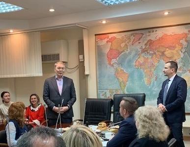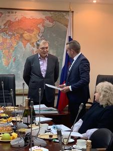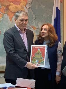 Руководитель аппарата Комитета Анатолий Середа вручил Благодарственные письма организаторам выставки, конкурса, фестиваля Новогодних елок 21 века и международного проекта «Новый год и рождество празднуем всем миром», которые прошли при поддержке Комитета, Департамента информации и печати Министерства иностранных дел Российской Федерации, Всемирного координационного совета российских соотечественников, проживающих за рубежом.