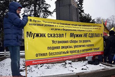 Основными лозунгами на митингах стали: «Льготы – народу! Голубева – на хлеб и воду!», «Требуем вернуть бесплатный проезд ветеранам труда!», «Мужик сказал! Мужик не сделал! Установил сборы за дороги, поднял акцизы, увеличил налоги, отнял бесплатный проезд у ветеранов труда!», «Россия без Ротенбергов!», «Сегодня заплатил дальнобойщик – завтра все!», «Дальнобойщики Дона за 100% отмену Платона», «Путин, верни вклады отобранные в 1991 году», «Вернуть льготы 30 км зоны АЭС!», «Остановить рост тарифов ЖКХ», «Досталось все миллионерам, а отвечать пенсионерам», «Бездарное Правительство Медведева – в отставку!» и др.