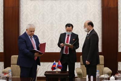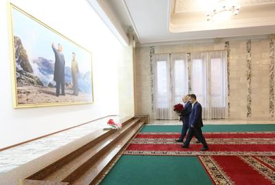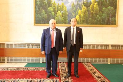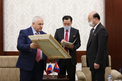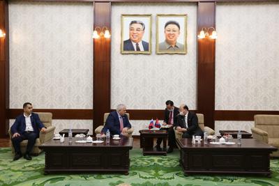 По традиции, перед началом встречи Казбек Куцукович Тайсаев и члены делегации возложили цветы к портретам лидеров Корейской Народно-Демократической Республики товарищей Ким Ир Сена и Ким Чен Ира.