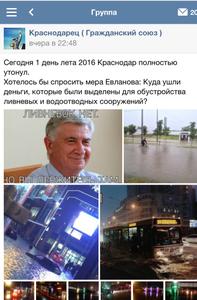 Вот ещё из бури возмущения, что отразилась в краснодарских соцсетях. "Сегодня 1 день лета 2016 Краснодар полностью утонул. Хотелось бы спросить мера Евланова: Куда ушли деньги, которые были выделены для обустройства ливневых и водоотводных сооружений?"