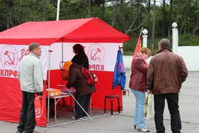 2 августа, магаданские коммунисты провели в центре города пикет со сбором подписей горожан в поддержку отставки правительства. Отлично смотрелись у входа в городской парк культуры и отдыха красная палатка с символикой партии и по обеим сторонам от нее стойки с флагами КПРФ.