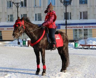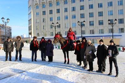 Особый колорит, напоминающий о революционных годах, внесла молодая девушка Светлана, дочь нашего товарища, коммуниста Ивана Андрусяк, прибывшая на площадь на таком экзотическом для Магадана животном как лошадь. На ней была одета накидка с символикой КПРФ, шарф и буденновка.