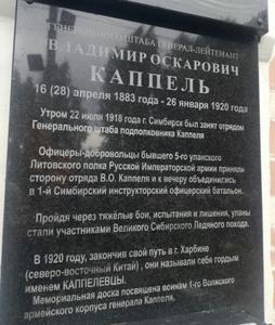 28 сентября 2018 года в Ульяновске состоялось открытие мемориальной доски белому генералу Владимиру Каппелю. В открытии доски на улице Тухачевского вблизи КПП Межвидового регионального учебного центра войск связи принимали участие глава Симбирской митрополии митрополит Анастасий, председатель Патриаршей комиссии по вопросам защиты семьи, материнства и детства протоиерей Дмитрий Смирнов, представители казачьих обществ, представители общества "Двухглавый орёл".