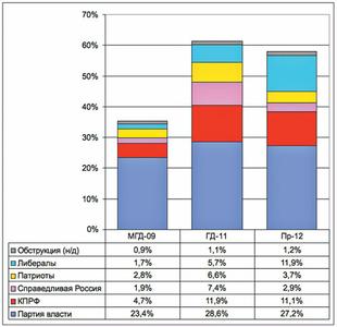 На диаграмме представлены результаты трех подряд голосований москвичей: на выборах в Московскую городскую думу 2009 года, в Госдуму РФ 2011 года и президента РФ 2012 года. Некоторые графы объединены для простоты восприятия. В графе «партия власти» объединены голоса за «ЕР» и Путина. В графе «патриоты» объединены ЛДПР и партия «Патриоты России». В графе «либералы» объединены партии «Яблоко» и «Правое дело», а также кандидат в президенты Прохоров. Графа «обструкция» отображает процент недействительных (или сознательно испорченных) бюллетеней. Прошу заметить, все цифры даны в процентах от списочного состава избирателей, так что их сумма образует официально оглашенную в протоколах явку. Назовем также сумму всех избирателей, кто не голосовал за «партию власти», «Другой Москвой».