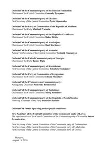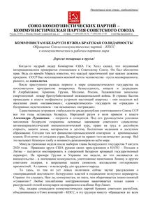 Мы, лидеры семнадцати коммунистических партий бывших советских республик, объединившиеся в Союз компартий – КПСС, в эту трудную минуту обращаемся ко всем коммунистическим и рабочим партиям мира с призывом оказать всестороннюю помощь нашим белорусским братьям!
