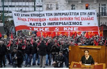 Со стороны правительства ПАСОК Г.Папандреупредпринял попытку прикрыть агрессию вуалью капиталистического «международного права», перечисляя, в сущности, прибыль, которую извлечет местная буржуазия из кровопролития в Ливии. На той же волне и в полном согласии с правительством прозвучала речь представителя партии НД. Председатель националистической партии ЛАОС пустой антиамериканской демагогией, в сущности, призвал правительство лучше договориться о предмете обмена, который получит местная плутократия от участия в империалистической агрессии. А председатель оппортунистической партии СИРИЗА выступил против агрессии, но потребовал от правительства играть в регионе роль, конкурирующую с ролью Турции.