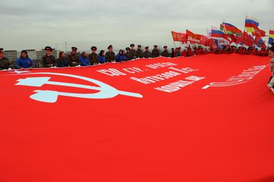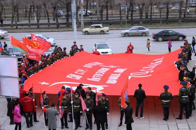 У подножия Мамаева Кургана участники международного автопробега, представители КПРФ, курсанты волгоградского казачьего корпуса имени Героя Советского Союза К.И. Недорубова, активисты молодежных организаций развернули масштабную копию Знамени Победы, с которой проследовали до скульптуры «Родина-мать зовет!». В Пантеоне Славы участники акции «Наша Великая Победа» возложили цветы и венки, оставив запись в Книге Памяти.
