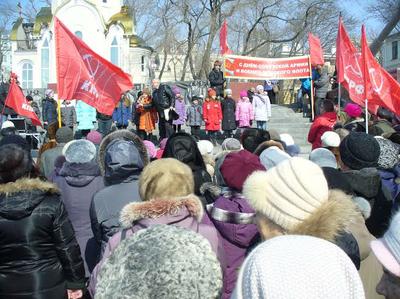 В самом начале митинга председатель Совета краевого отделения «Союза советских офицеров» полковник в отставке, участник боевых действий в Афганистане, кавалер многих боевых наград Борис Строкач и первый секретарь комитета Приморского краевого отделения КПРФ, руководитель фракции коммунистов в Законодательном Собрании Приморья Владимир Гришуков вручили медали КПРФ группе ветеранов. А затем перед участниками митинга выступила с литературной композицией, посвящённой Советской Армии и Военно-